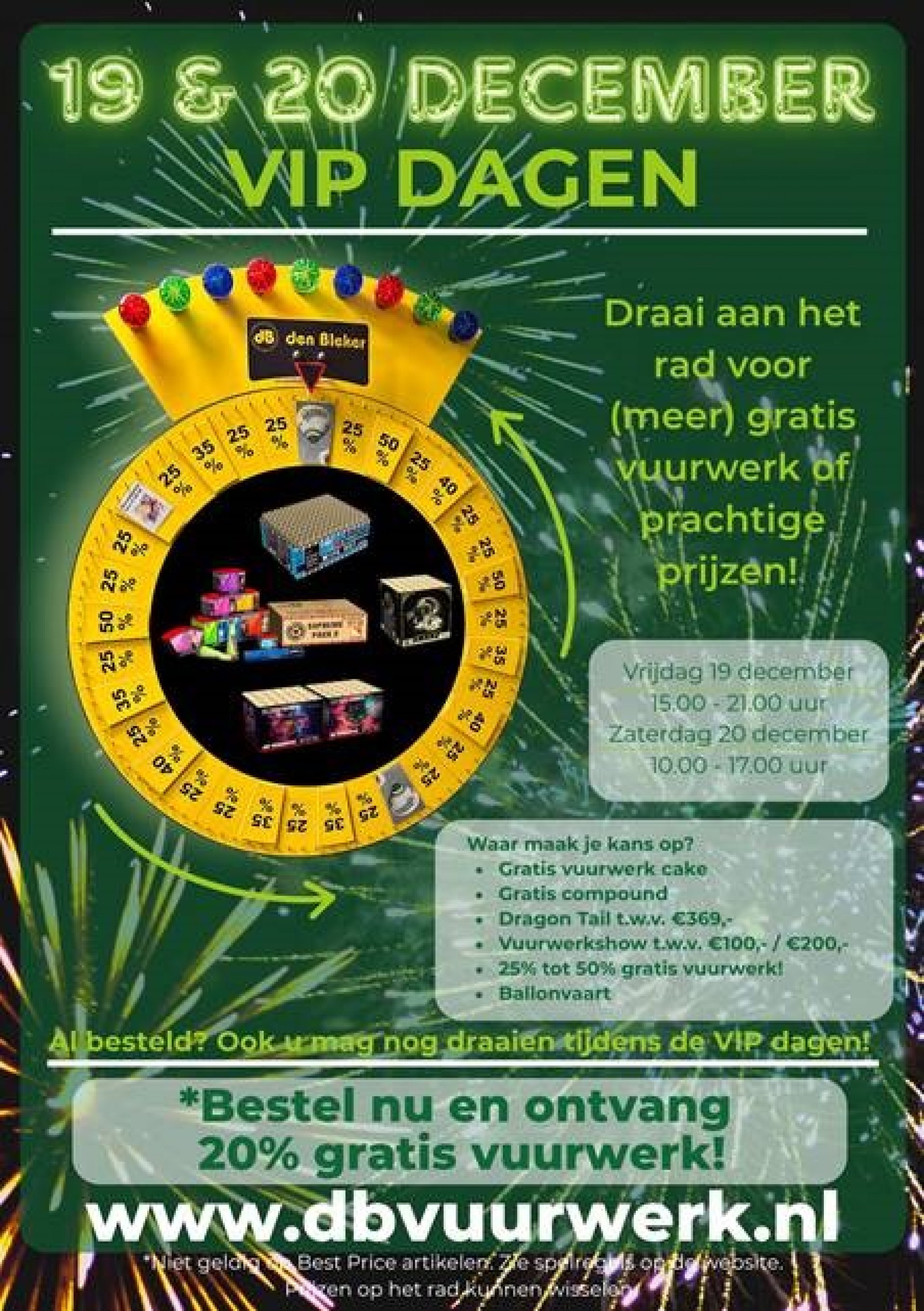 Als u voor of tijdens de VIP dagen online of in de winkel vuurwerk besteld mag u aan het rad draaien en maakt u kans op: